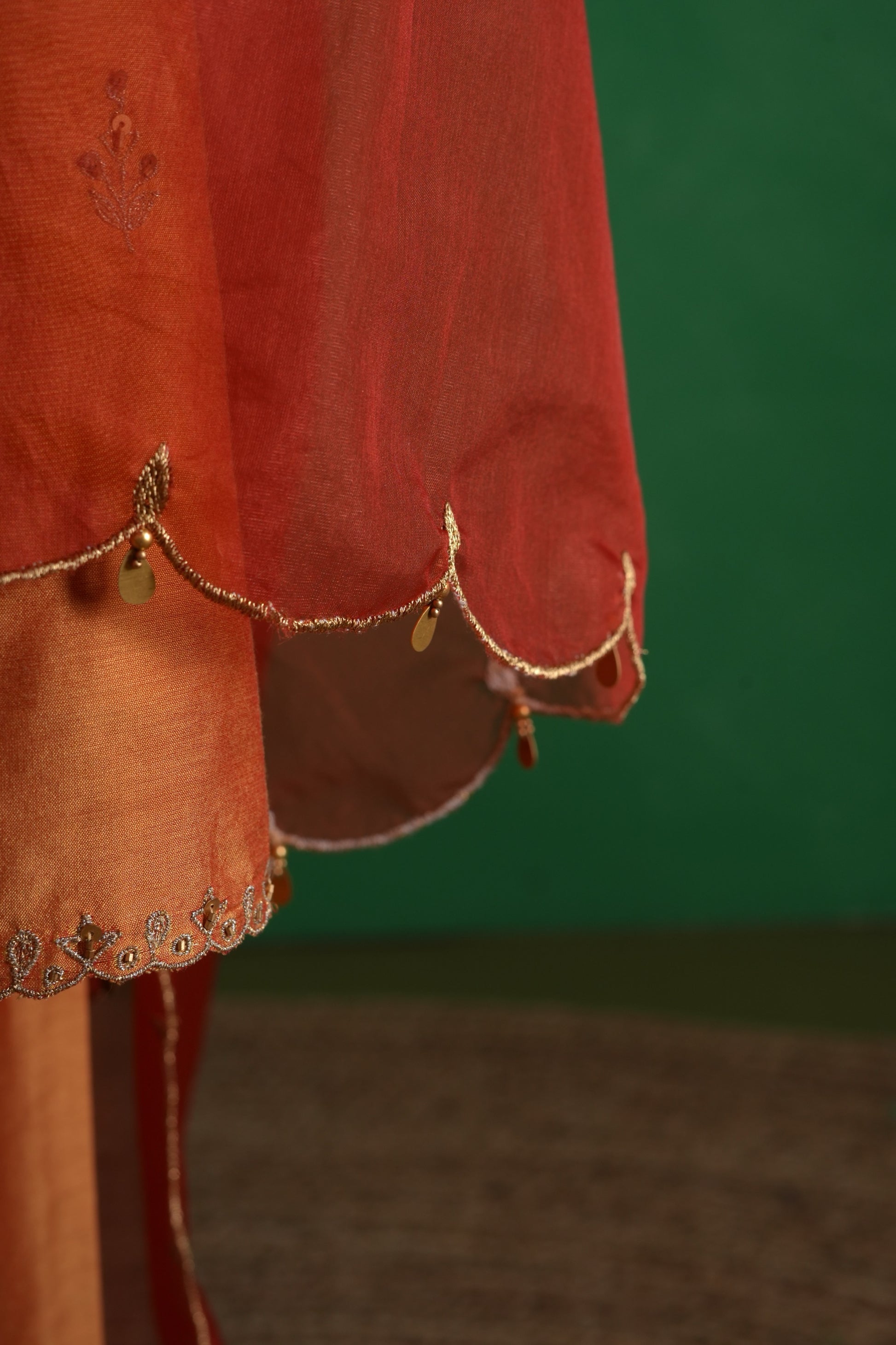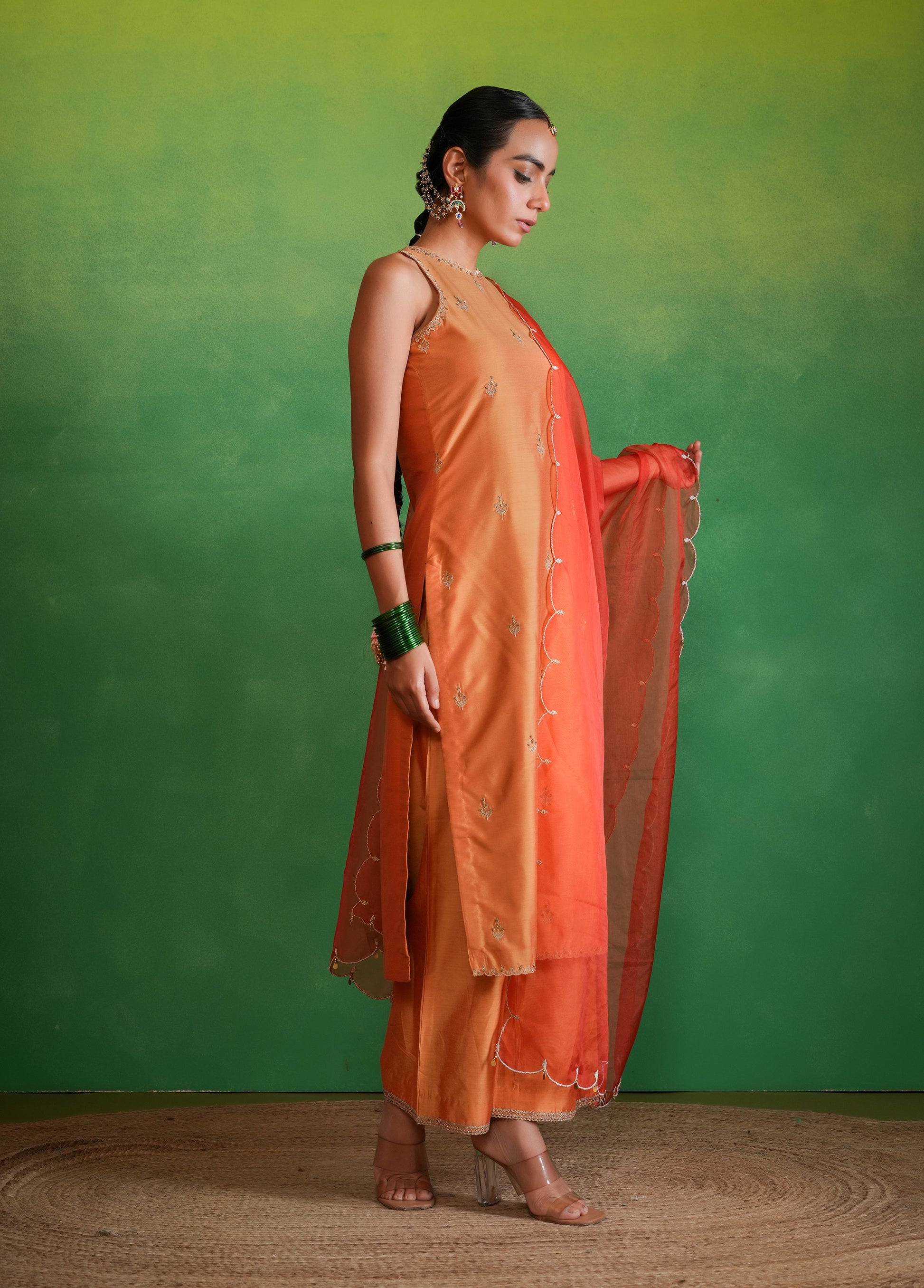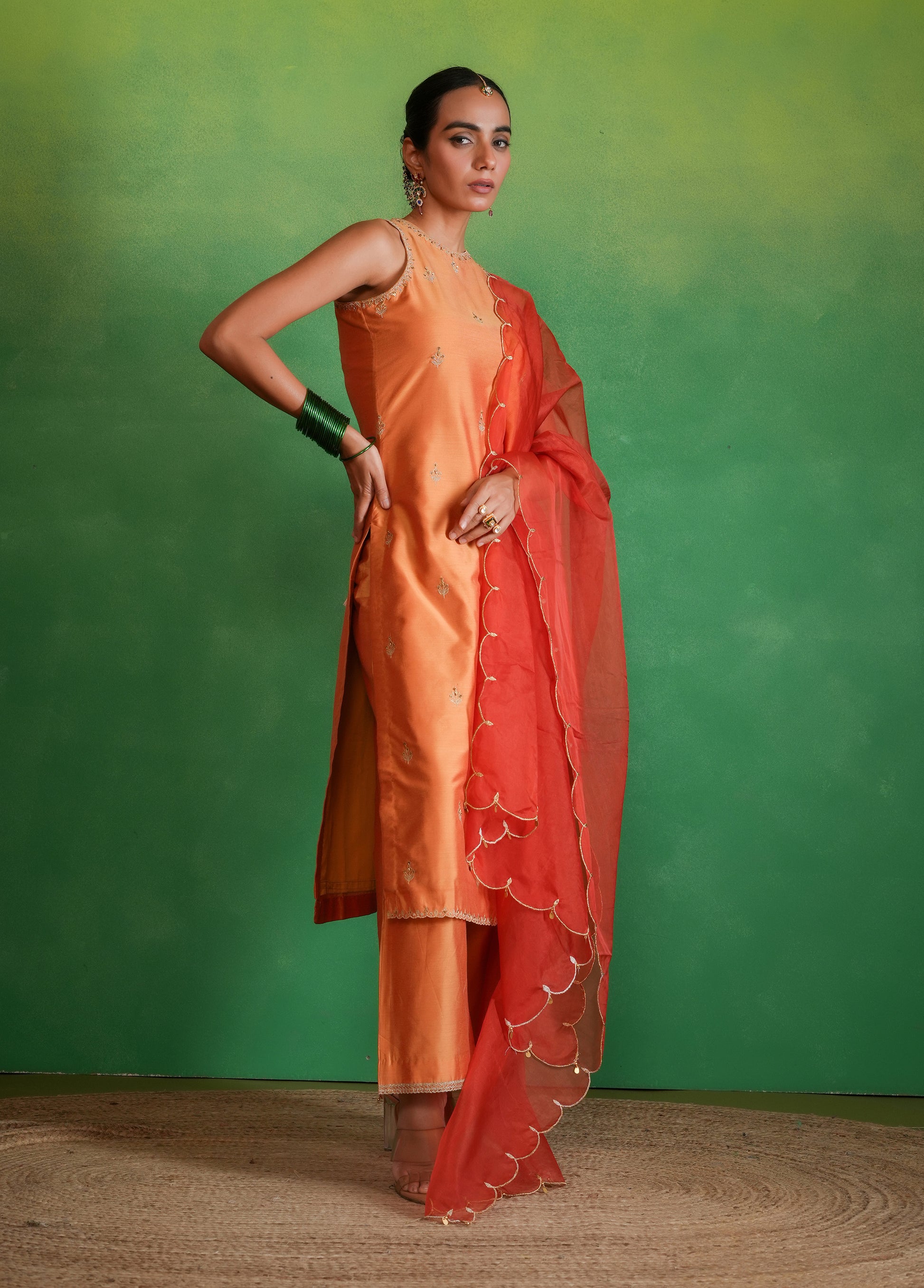 The amber halter-neck kurta set in dual-tone cotton silk features intricate ari and zari hand embroidery with fine scalloped detailing on the hem. Paired with straight-fit pants and an organza dupatta finished with scalloped edges and metal drop sequins, it blends a modern silhouette with traditional detailing.