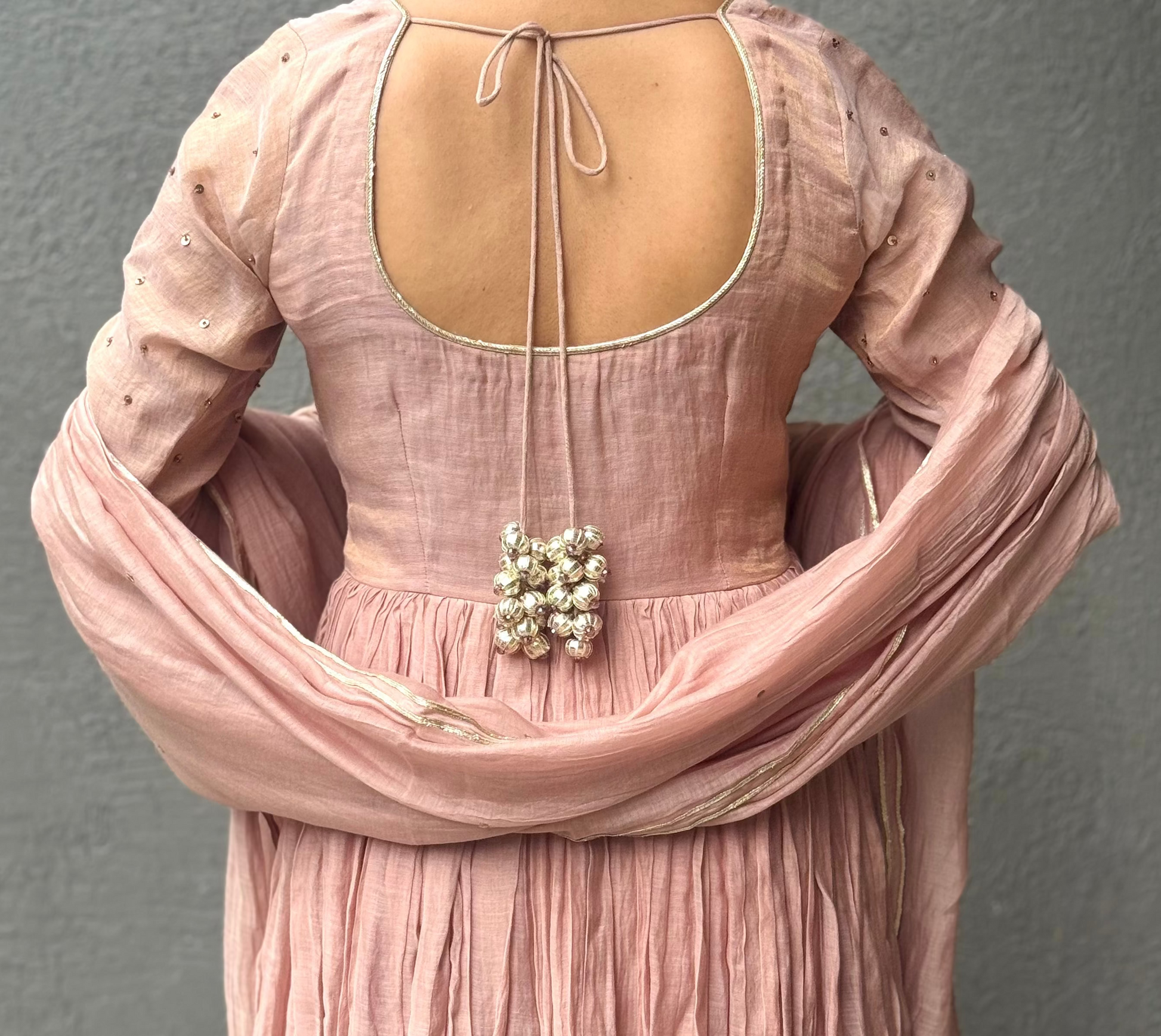 Crafted with timeless charm, this blush pink Anarkali features a mul chanderi flare with gota lace and a tissue chanderi bodice. Handcrafted ari embroidery enhances both the Anarkali and dupatta, paired with a classic chooridar and lightweight dupatta. Finished with playful gota ball hangings and delicate back tassels, it exudes effortless elegance.