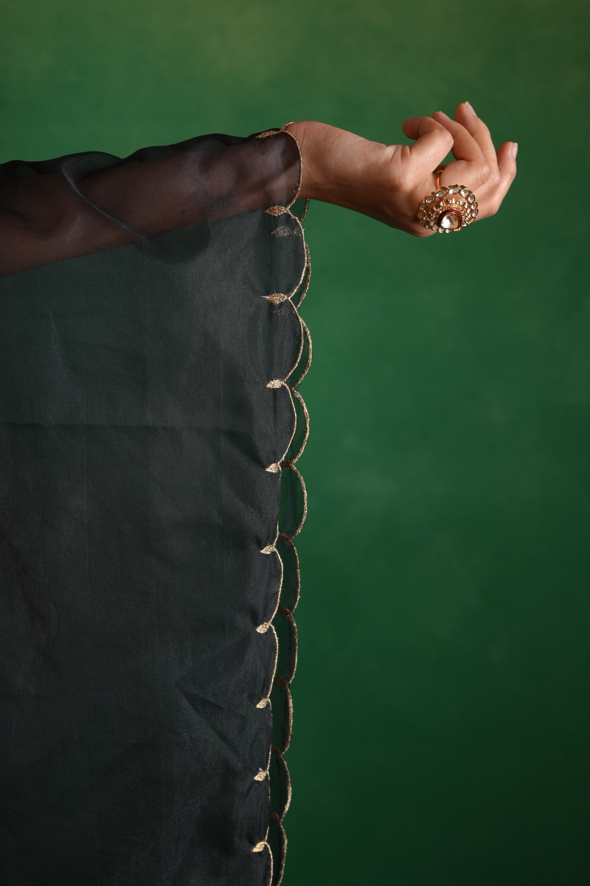 The regal short kurta sharara set in luxurious dupion silk features exquisite ari and zari embroidery with fine scalloped detailing on the hem and sleeves. Paired with a flowing kalidaar sharara accented with delicate gota work and tassels, and a lightweight organza dupatta with scalloped edges and metal drop sequins, it creates a festive and refined look.