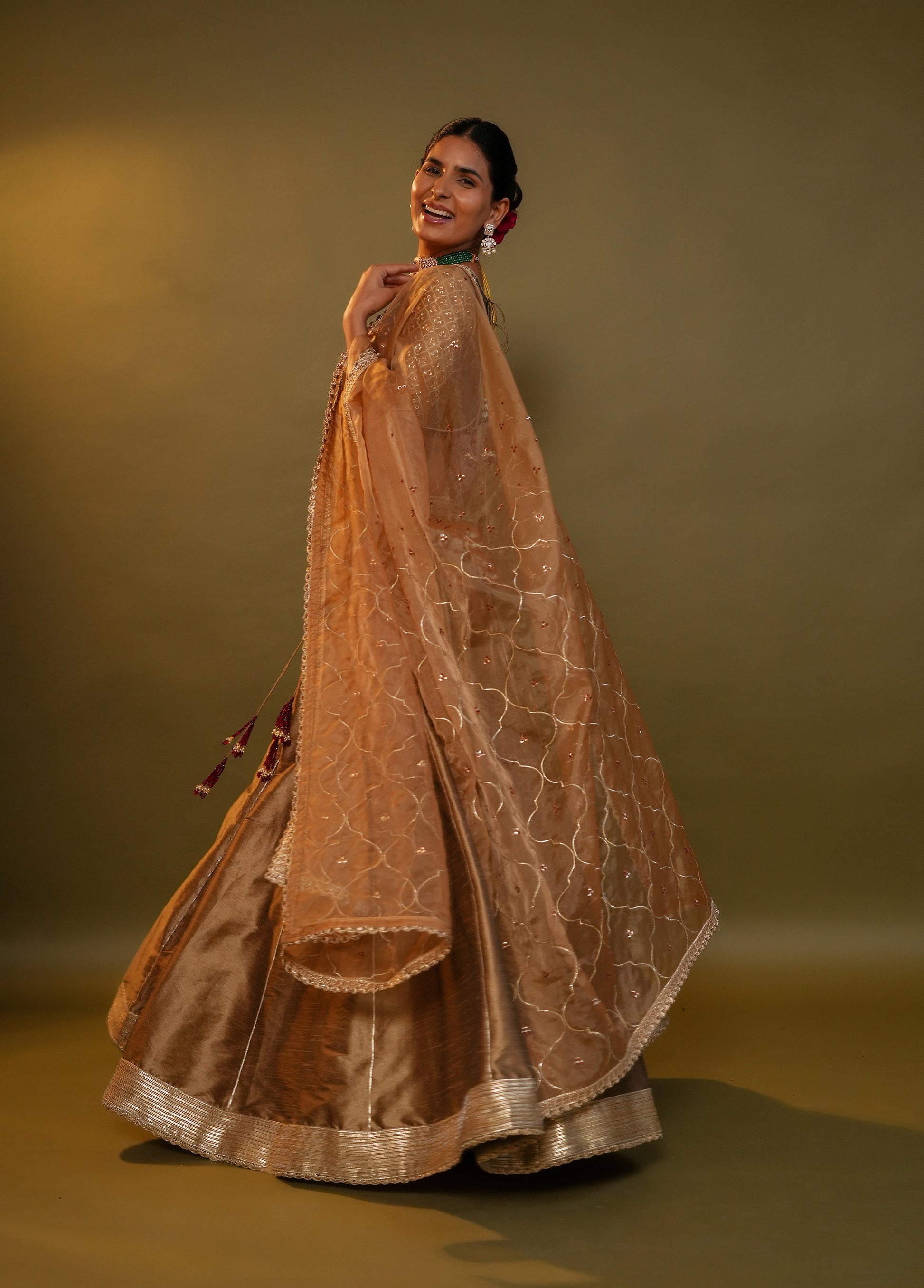 A vision in antique gold, this lehenga set blends timeless richness with modern allure. Crafted in dupion silk with deep wine accents, it features ari and gota embroidery throughout. The structured blouse with wine-toned cups adds a contemporary touch, while handcrafted crystal and pearl tassels on the blouse back and lehenga add festive movement. A sheer organza dupatta completes the ensemble for unforgettable occasions.