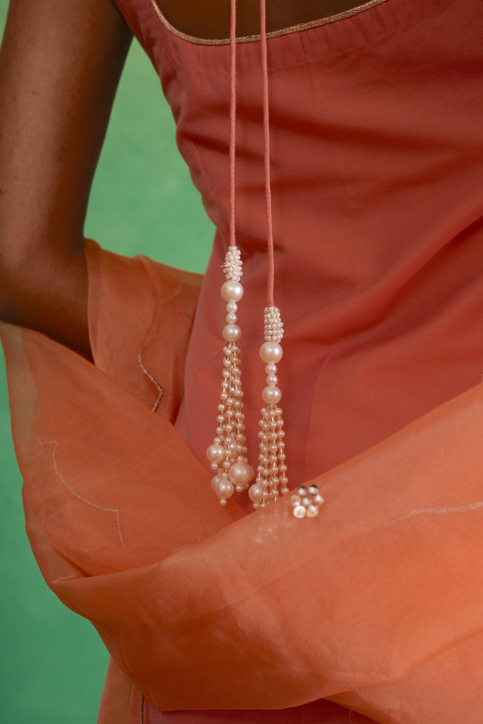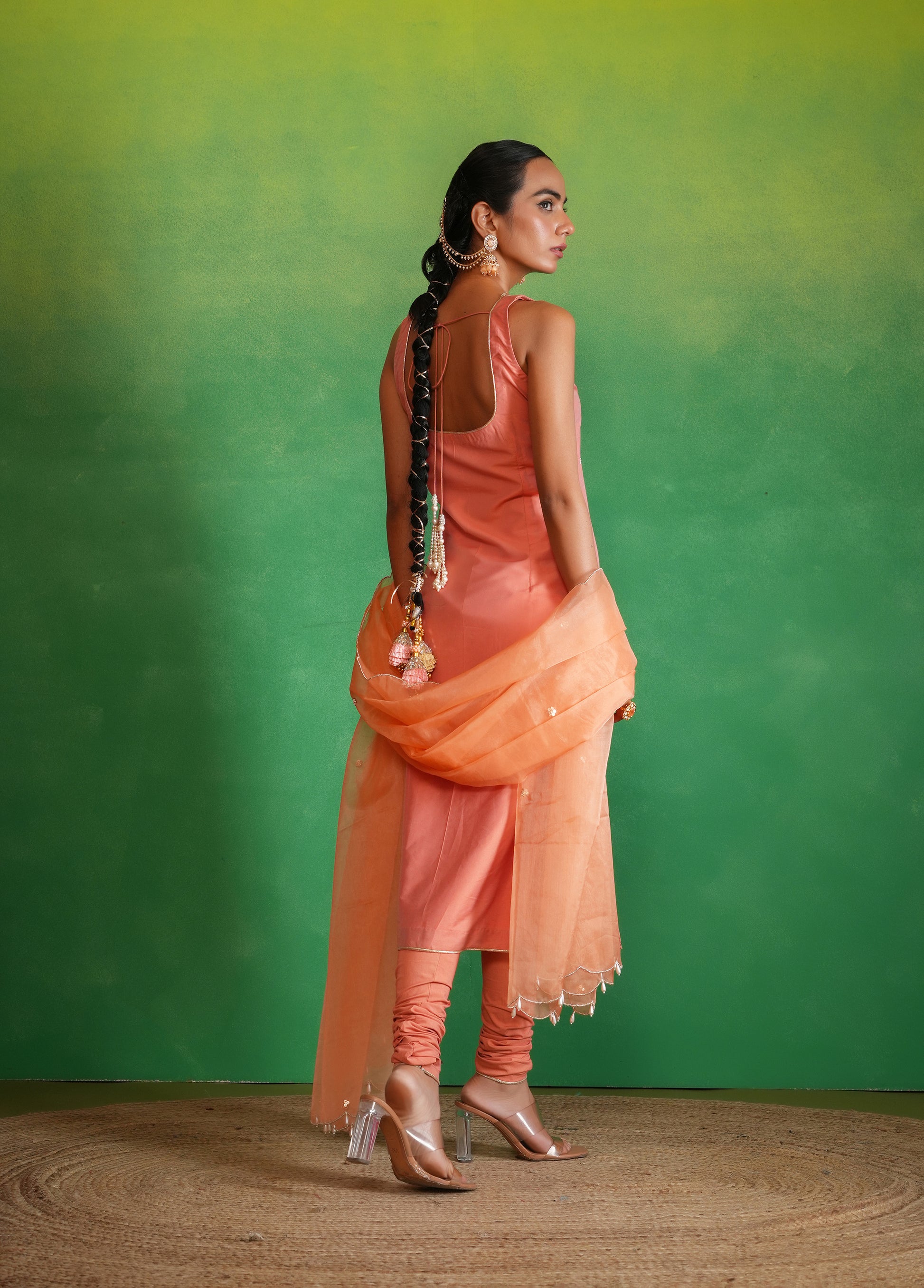 Soft and graceful, the peach sleeveless straight kurta set features delicate ari and jari embroidery, complemented by a pearl tassel detail at the back. Paired with a classic chooridar and an embroidered dupatta finished with scalloped edges and pearl hangings, it creates a refined and feminine look.