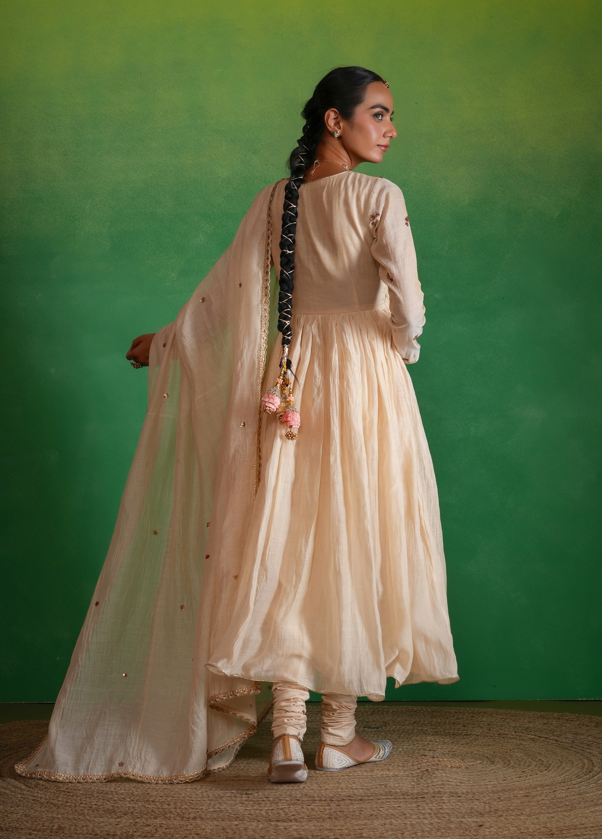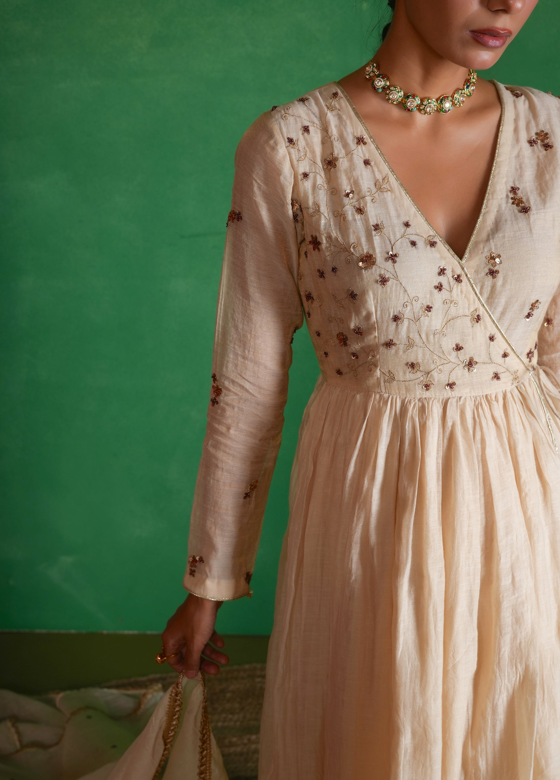The Angrakha features a rich tissue chanderi bodice with a delicate floral jaal in ari and jari embroidery, secured with dori ties adorned with crystal pearl tassels. Its soft mul chanderi flare is finished with a detailed lace border, while full sleeves with tassel accents add graceful movement. Paired with a traditional chooridar and an embroidered dupatta for a refined, classic look.
