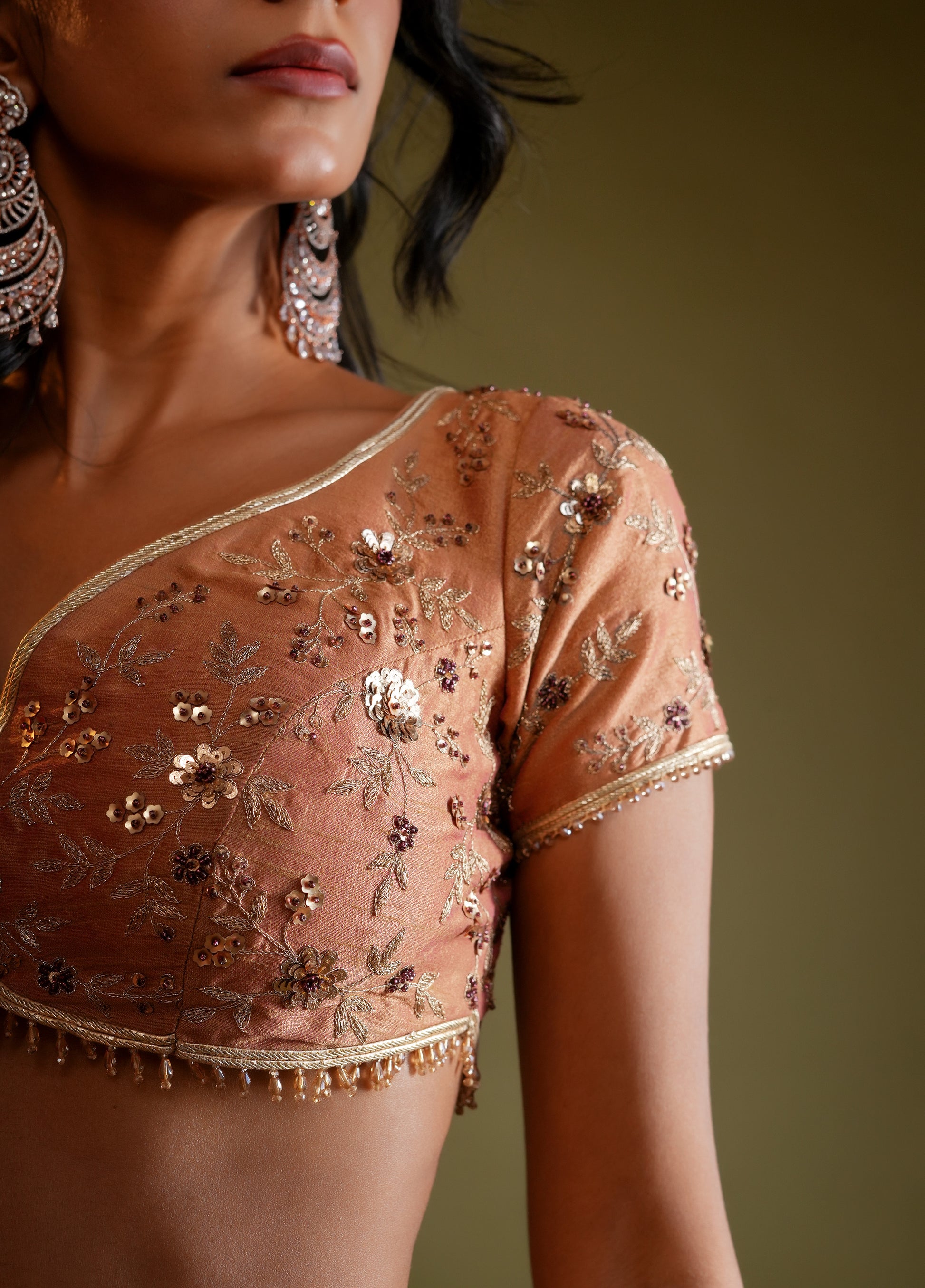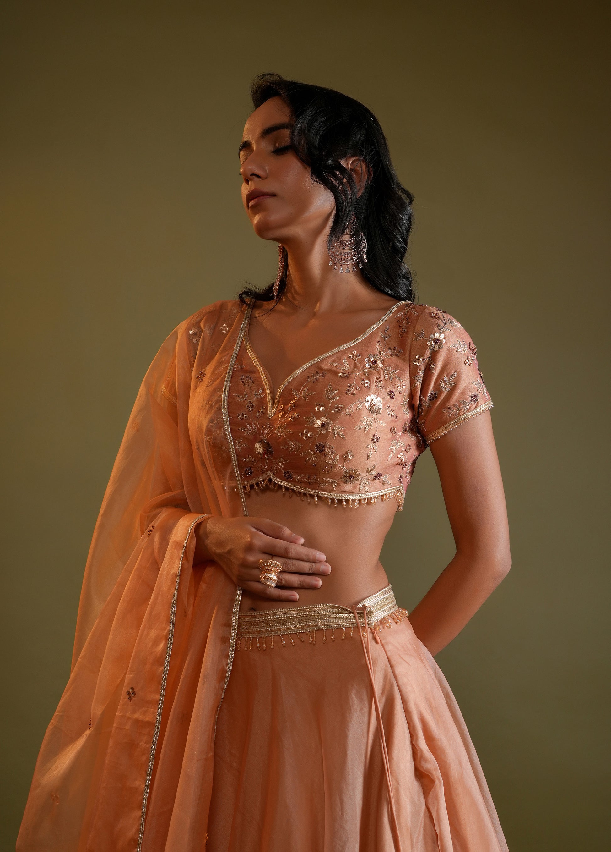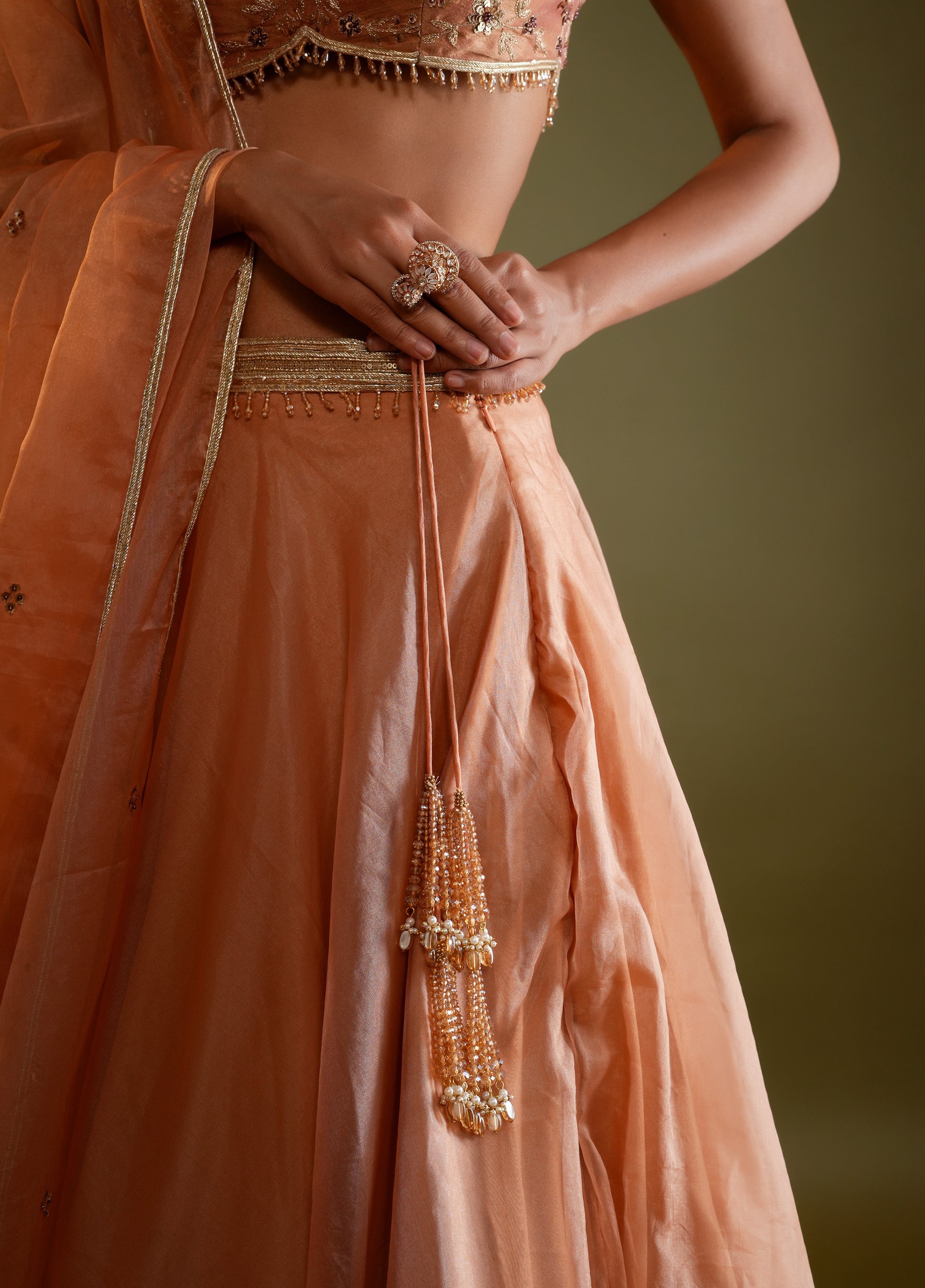 In soft peach, this lehenga set features a structured dupion blouse with intricate ari–zari embroidery and crystal-pearl accents. It’s paired with a flowy organza lehenga and dupatta, finished with handcrafted tassels on the waist and pallu for a refined, graceful look.